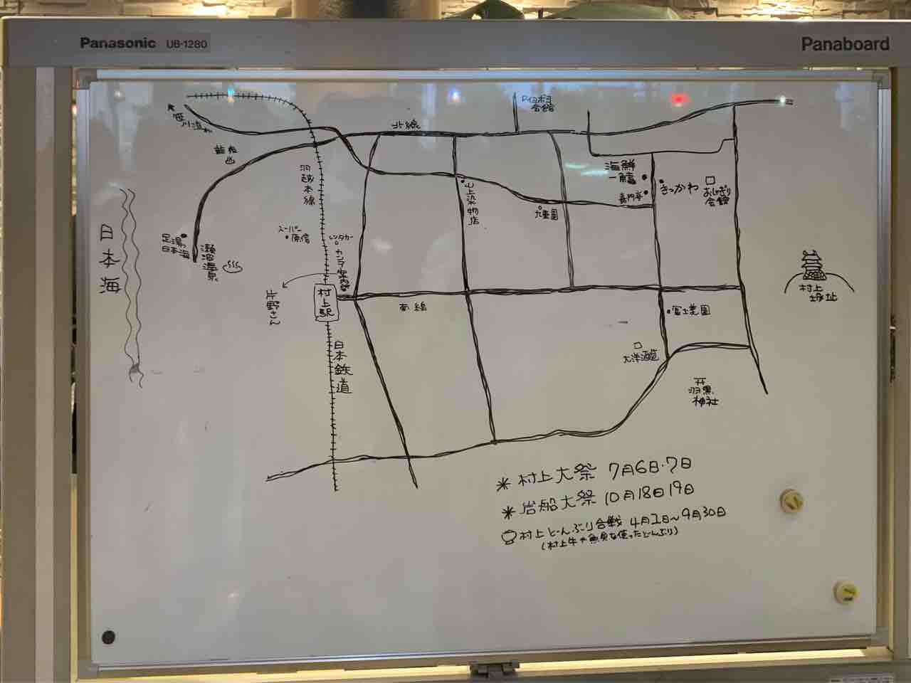 会場を出ると…熊さん直筆の村上マップが描かれたホワイトボード」があって、皆さんカメラにおさめていましたよ。