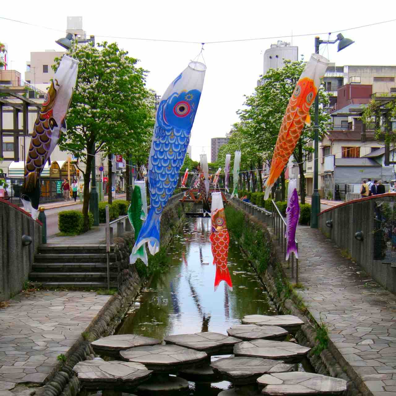 熊谷駅近くの小川にずらりと並んでいた鯉のぼり ↑